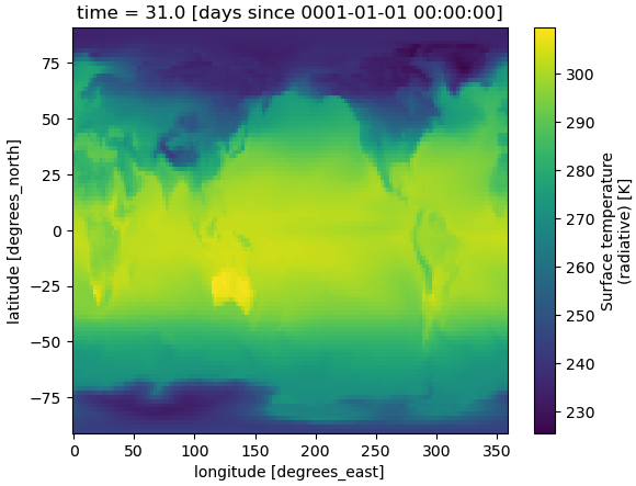 Below, I load the atmospheric dataset, find the temperature-related variables in the Dataset and plot the surface temperature averaged over the first month.
